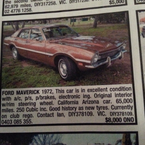I see in the December issue of the Australian Uniquecars there is a 1972 four door maverick, 6 cylinder forsale in Victoria for $8, 000
