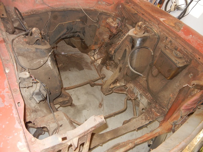 empty engine compartment of the 70 Maverick parts car